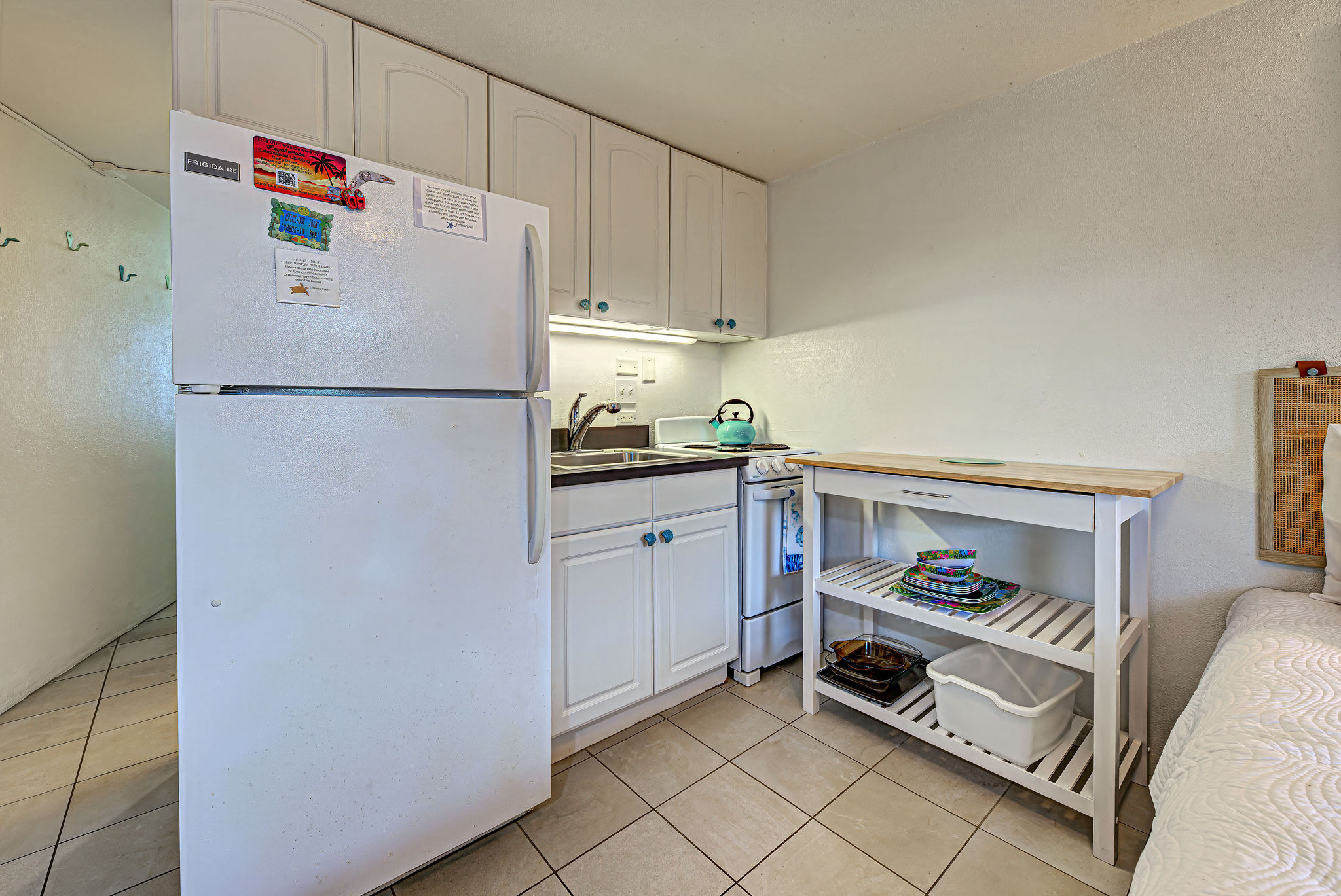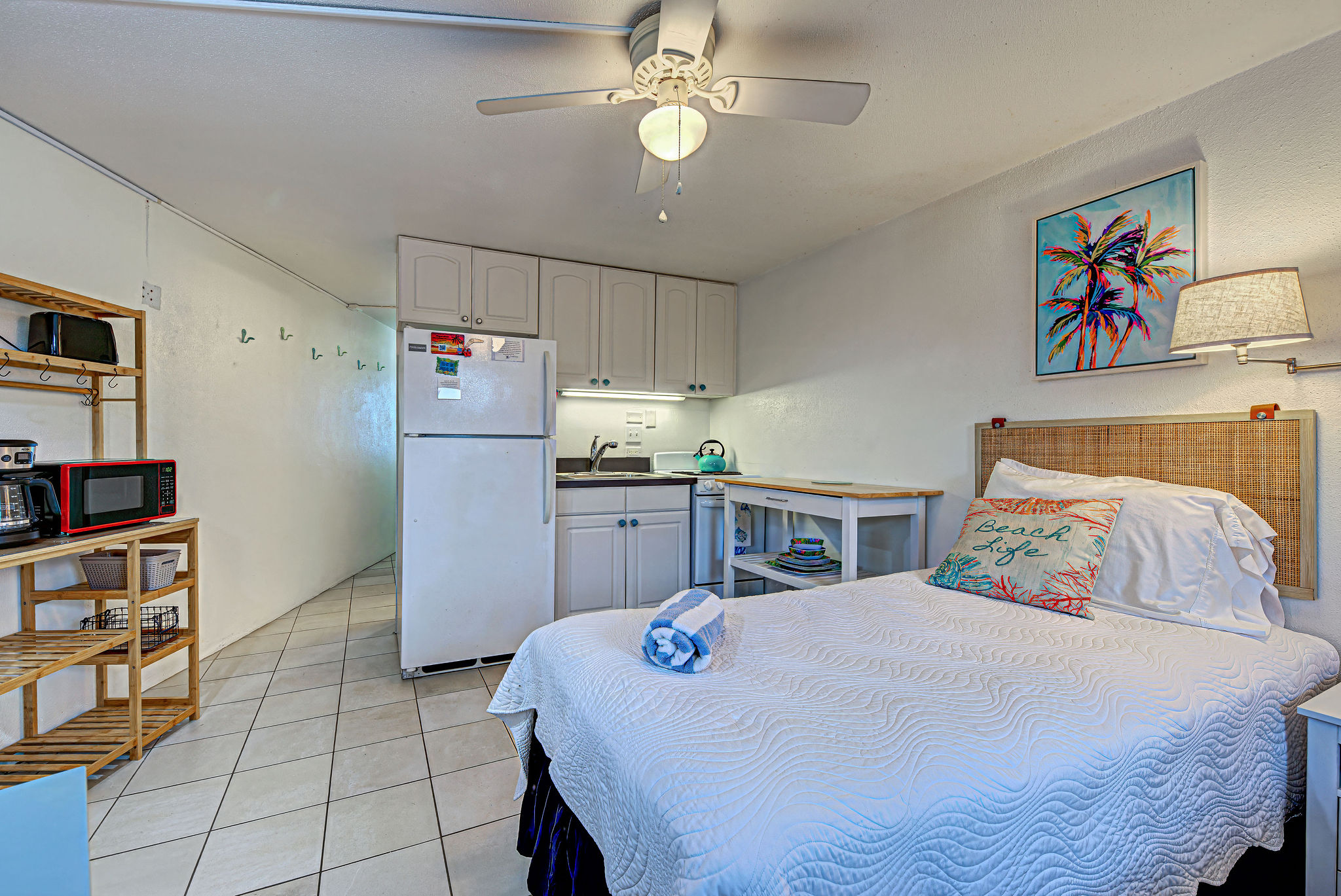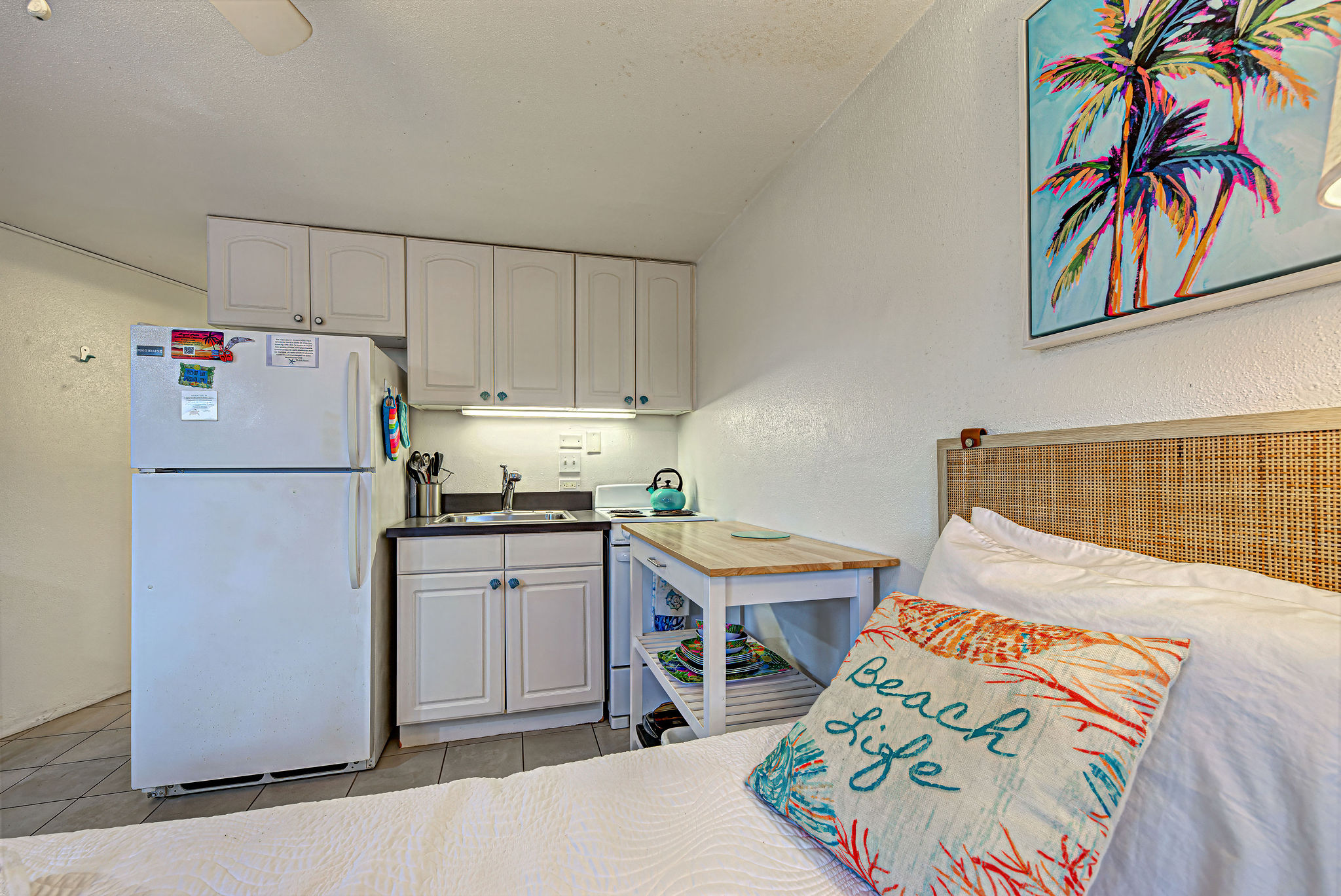 - Fully equipped kitchen with full size refrigerator, stove, oven, microwave and coffee maker